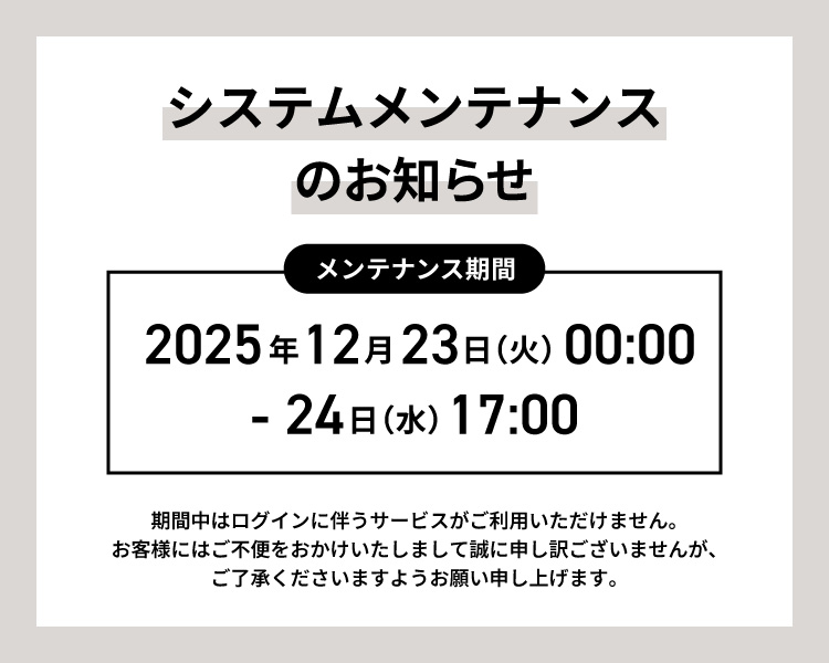 2025年12月23日(火)00:00 ~ 24日(水)17:00までシステムメンテナンスを実施いたします。